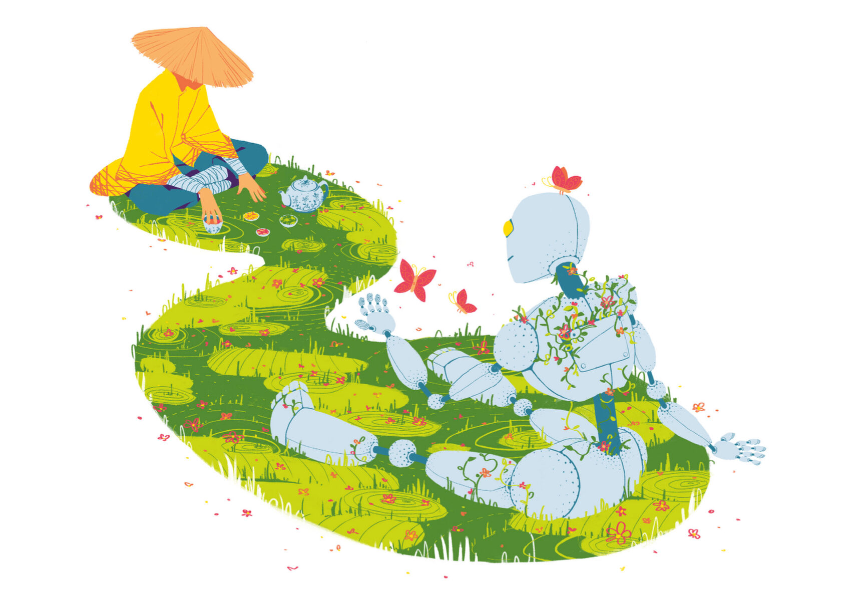 Związki między technologią i przyrodą szczególnie podkreślane są przez zajęcia oraz zainteresowania robotów – obserwację oraz badanie różnorodnych struktur w środowisku naturalnym. Niektóre z charakterystycznych dla niego relacji wzbudzają w maszynach smutek oraz poczucie niesprawiedliwości, ale mimo tego rozumieją zachodzące cykle narodzin i śmierci, które przekładają na sposób postrzegania samych siebie. Konstrukty są nietrwałe i wpisują się we wszechobecne przemijanie, chociaż nie oznacza to, że upodabniają się do zalegających w dziczy struktur z czasów Epoki Fabryk. Kolejne pokolenia robotów powstają dzięki ponownemu wykorzystaniu części i nadawaniu im nowego przeznaczenia, co przypomina nie tylko nowoczesne ludzkie rozwiązania infrastrukturalne i technologiczne, ale także jest odwzorowaniem procesów natury.